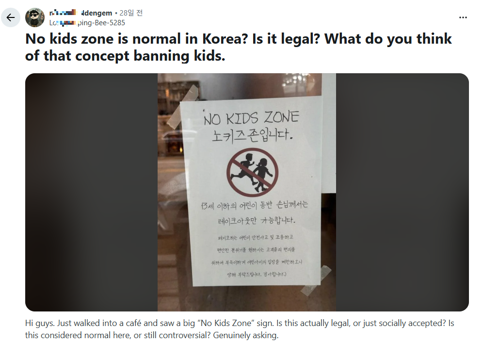 세계 최대 커뮤니티인 레딧(Reddit) 유저들 역시 한국의 노키즈존 표지판을 보며 뜨거운 설전을 벌이고 있습니다. 레딧 토론장의 유저들은 아주 직설적입니다. 노키즈존 찬성파들의 주장을 관통하는 핵심은 하나였습니다