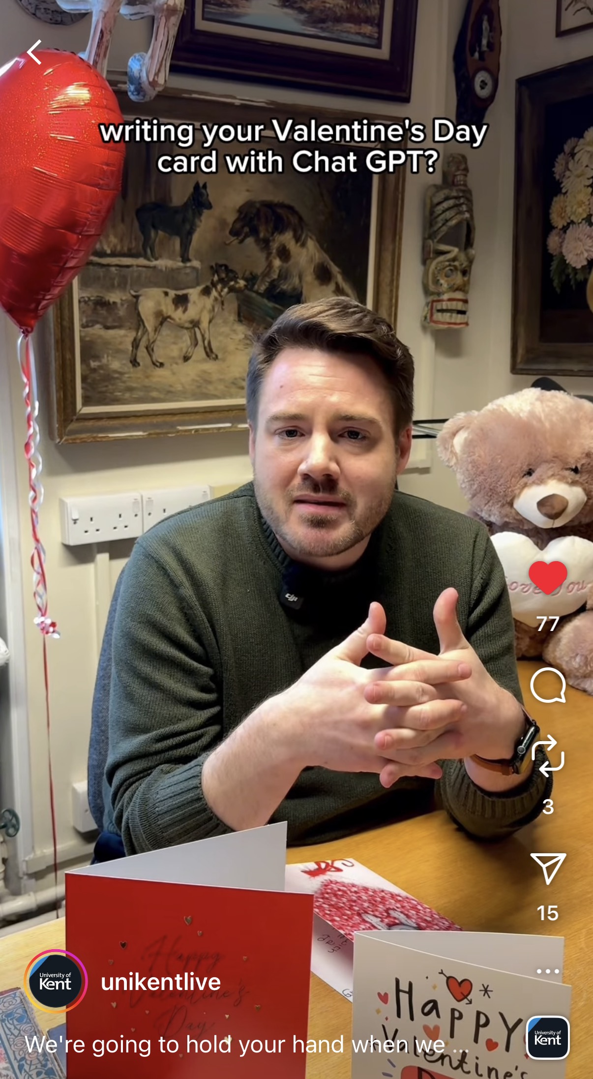 그런데 오늘 제 인스타에 흥미로운 연구 결과가 있어 여러분들에게도 공유하고 싶어요. 영국 켄트 대학교(University of Kent)의 연구에 따르면, "Chat GPT를 사용해 발렌타인 카드나 연애 편지를 쓰는 것에 대해 사람들은 매우 부정적인 반응을 보인다"고 합니다. 심지어 '신뢰할 수 없다(untrustworthy)'거나 '게으르다(lazy)'고 하면서요.