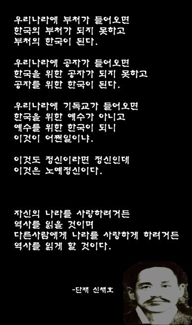 외래의 사상과 종교가 한국에 들어오면 우리의 것이 되지 못하며 그에 종속되고야 마는 것을 비판한 단재 선생님의 명언이 아닌가 싶습니다. 이외에 다음과 같은 명언이 남겨져 있습니다.