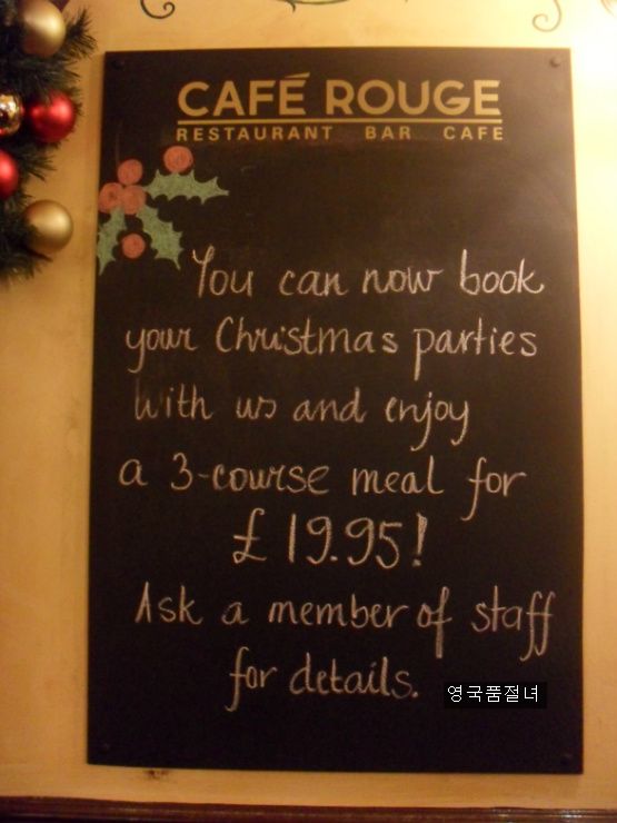 아무튼 저는 올해 첫 크리스마스 디너에 참석했습니다. 이번 크리스마스 디너는 영국인들에게 잘 알려진 프랑스 레스토랑인 Cafe Rouge에서 이루어 졌지요.