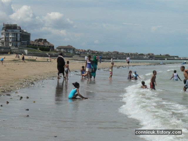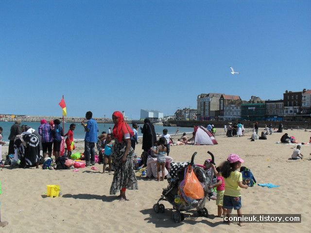 저희가 자리를 잡은 자리는 여기가 영국 해변인지, 아프리카의 해변인지를 다소 헷갈리게 할 정도로 주변에 피부가 검은 사람들이 많더라고요. 아마도 마르게이트가 다소 저소득계층이 많이 산다는 사실을 반영해 주는 것만 같았습니다. 캔터베리에는 많이 보지 못했던 사람들이었거든요.