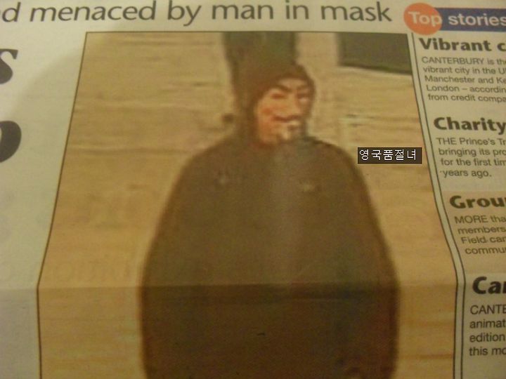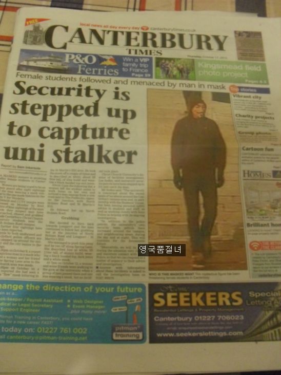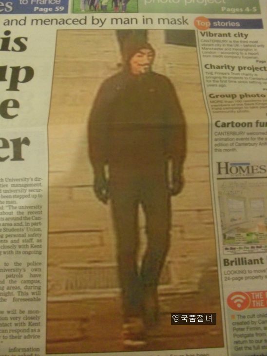 지난 주 BBC 뉴스 및 캔터베리 타임즈에는 가면 쓴 남자의 기사가 실리는 등, 경찰들은 여학생들에게 절대로 밤에 혼자 돌아다니지 말라고 각별히 주의를 당부하고 있습니다. 그 남자의 인상 착의는 검은색 후드티, 진한색 청바지를 입은 키가 크고 마른 백인 남자로, 호러 가면을 쓰고 여학생들에게만 접근하고 있다고 하네요.