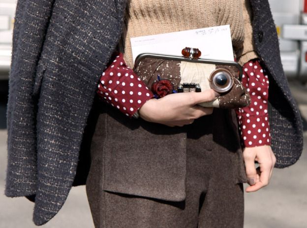 전체적인 브라운 계열과 잘 매치되는 특이한 모양의 클러치 백이에요. 꼭 눈알처럼 보이지 않나요?
