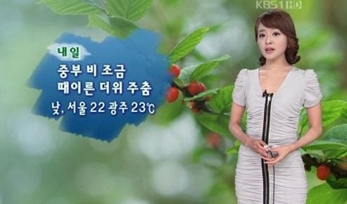 최근에는 기상 캐스터들의 인기는 상승 추세인 것 같아요. 그들은 연예인이라고 불릴 정도로 남성들의 인기를 한 몸에 받고 있지요. 또한 그들의 외모, 의상 등등에 관한 모든 것들이 가십거리에요. 특히 얼마 전에는 한 KBS 기상 캐스터의 옷차림으로 인해 찬반 논란이 있었어요. 개인적으로 그녀들의 개성있는 옷차림에 반대하는 것은 아니지만, 그녀가 전하는 뉴스내용 보다는 자꾸 그녀의 옷차림에 신경이 쓰이기는 하더라고요.