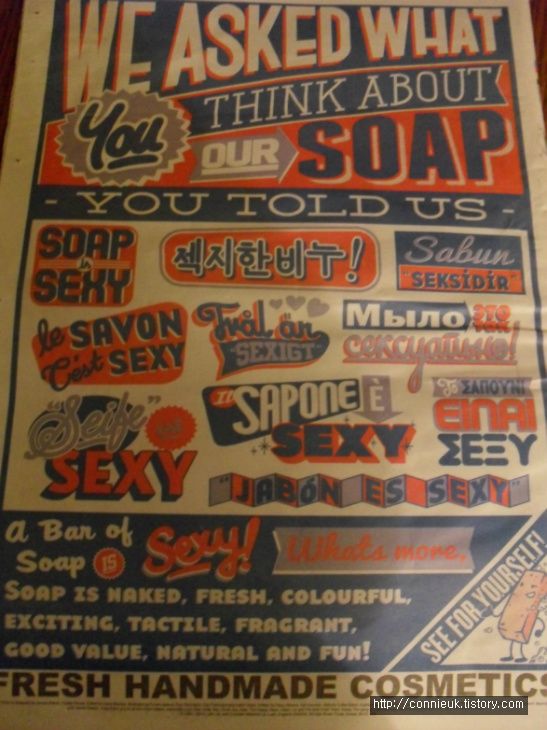 2월에 발행된 러쉬 타임즈에 "러쉬 비누에 대해 어떻게 생각하냐? 라고 물었더니 다양한 국적의 사람들이 "섹시한 비누"라고 답을 했답니다. 러쉬 제품이 한국에서도 인기가 있다는 증거가 바로 여기에 있어요. 영국에서 이렇게 한글을 보니깐 기분 좋더라고요. ^^ (일어가 없다는게 좀 신기하네요.)