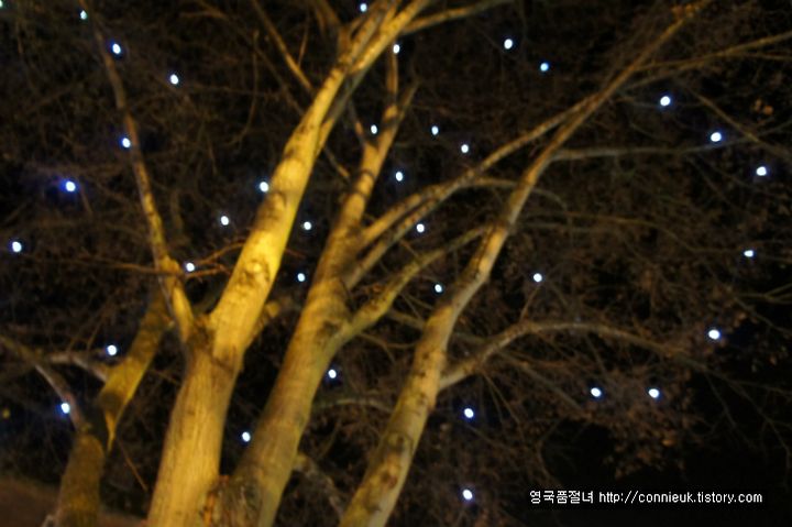 하늘에 수놓인 것처럼 파란 크리스마스 불빛이 반짝이는데, 괜히 제 맘이 설레이네요. ㅎㅎ