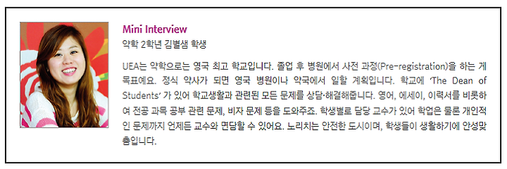 청년 실업률이 갈수록 악화되는 영국에서도 UEA 약학은 취업과 평생 직장을 보장해줄 수 있는 전공으로 인식되며, 해외 학생도 본인이 희망한다면 졸업 후 현지 취업이 용이하기 때문에 인기있는 전공입니다. 국제 개발학 역시 영국 최고로 꼽히며, 과정을 마친 뒤 NGO나 유엔 기관 등으로 진출하는 기회가 많은 편입니다.