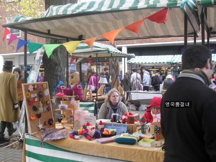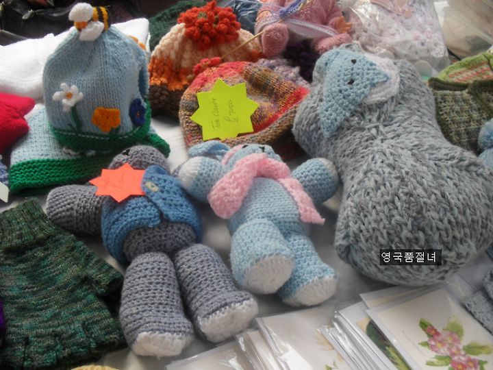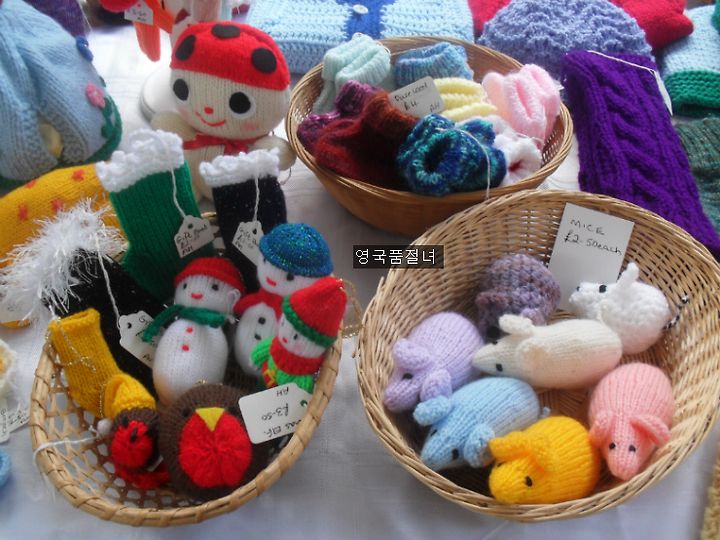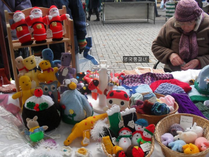 종종 영국 여자들은 직접 만든 뜨개질 작품들을 거리에서 팔기도 해요.