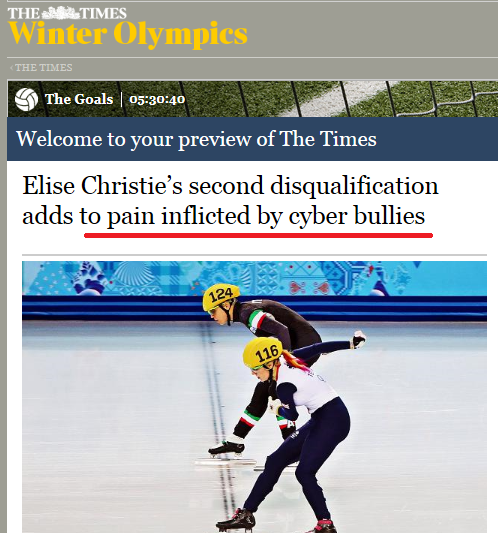 그런데 더욱 우려스러운 일은 바로 "자국 선수가 한국 팬들로부터 사이버 테러의 표적이 되었다" 는 것입니다. 이틀 전 2월 15일자로 발행된 대부분의 영국 언론 매체에서는 사이버테러(Cyber Bullying, Twitter Abuse)를 당한 쇼트트랙 크리스티 선수의 기사를 앞다투어 실었습니다. 이에 영국(GB) 동계 올림픽 자문팀에서는 크리스티의 앞으로 남은 경기를 위해 공식 트위터 계정을 삭제하기로 결정했다고 전했습니다. (페이스북 계정도 없어졌어요.) 제가 읽은 약 10개 정도의 언론 매체 기사에서는 대부분이 단도직입적으로 주요 사이버 테러 공격처를 한국이라고 명시하고 있지요. 제목부터 한국을 언급한 기사도 있습니다.