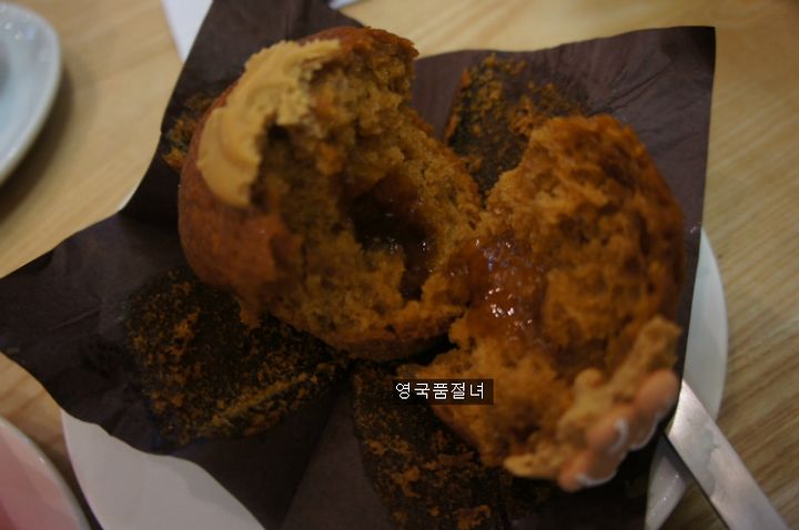 진저브레드 머핀은 안에 완전 진한 진저 쨈과 진저가 씹혔어요.