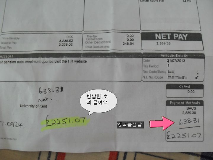 첫 급여일이었던 7월 31일 아침, 저는 학교에 있는 현금 지급기를 통해 월급이 얼마나 들어왔나 체크를 했다가 깜짝 놀라고 말았습니다. 제 계산대로라면 한 £ 600 (110만원) - 세금도 떼야 하고, 중간에 학회 참석과 이런 저런 일로 결근을 했었기에 - 정도를 받아야 하는데.....