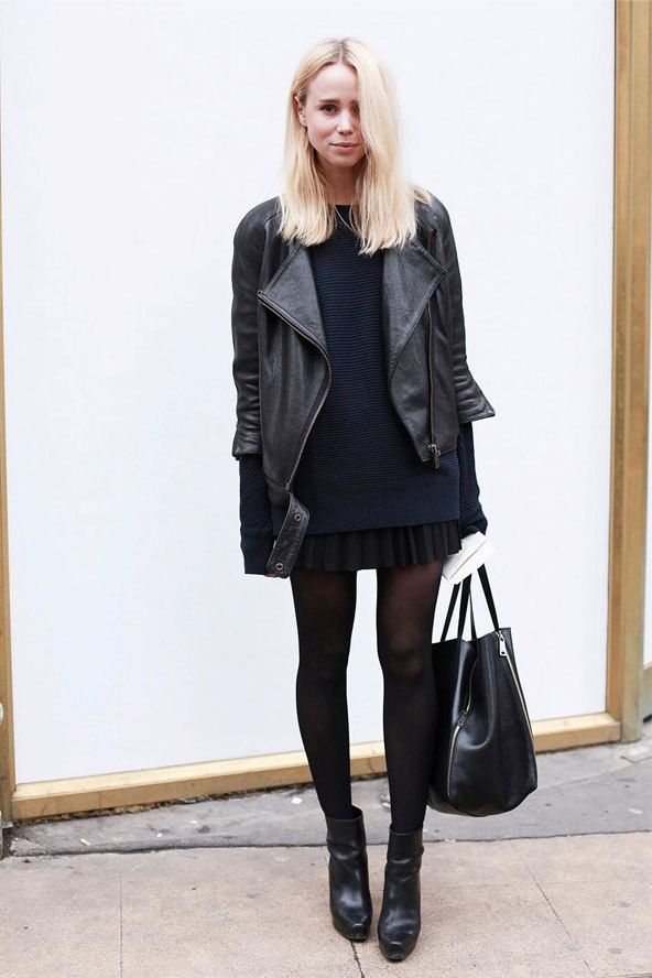 화려한 미니 드레스와도 잘 어울리는 가죽 자켓.