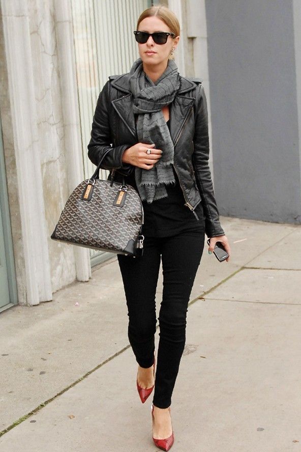 블랙 이너와 블랙 가죽 코트에 포인트가 된 목걸이와 팔찌등으로 화려한 스타일링도 가능~ 니키 힐튼의 심플한 가죽 자켓 코디에요. 간편한 스타일이네요.