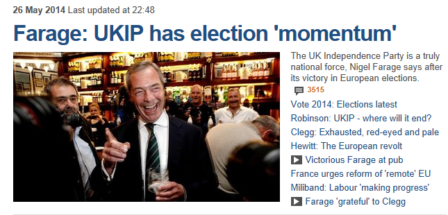 엊그제부터 영국에서 가장 큰 이슈는 바로 영국 내 우파 정당인 영국독립당(UKIP)이 유럽의회 선거에서의 돌풍입니다. 연립 여당인 보수당 및 자민당은 물론이고 야당인 노동당 보다 훨씬 많은 표를 얻어 영국 내 제1당이 되었습니다. 국내 총선이 아니기 때문에 현실 영국 정치에 미치는 실질적인 영향력은 제한적일 듯 합니다만, 그 동안 영국 총선에서 단 1석도 얻지 못했던 극우 정당이 제 1당이 되었다는 사실 자체가 영국 내에서도 엄청난 사건으로 받아들여집니다.