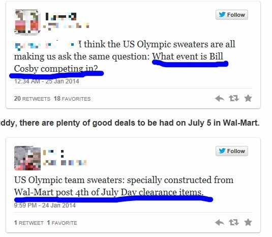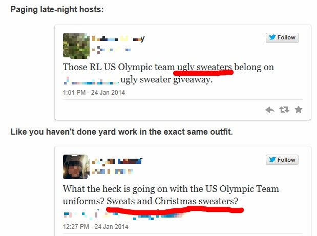 소치 올림픽 개막식에 각국 선수들의 유니폼이 선보였는데요, 그 중 미국 대표 선수들의 유니폼을 비난하는 트위터 및 댓글이 폭발했습니다. 자국민들은 유니폼으로 입고 나온 스웨터를 보고 충격에 휩싸였다고 하는데요, 각 종 언론 매체 및 패션 잡지에서도 일제히 미국 올림픽 유니폼에 대해 워스트라고 평가해 놓고 있지요.