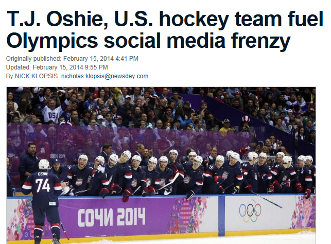 이날 경기가 끝나자마자 Oshie의 트위터는 그야말로 폭주~ 당일에 45,000명의 새로운 팔로워가 생겨났고요.경기가 있던 당일 날만 수많은 팬들, 선수들, 유명인들의 900,000 트윗과 130,000건의 멘션이 있었답니다. 지금까지 소치 올림픽에서 소셜 미디어 상에서 가장 인기가 많은 주제(Hashtag)로 선정되었어요.
