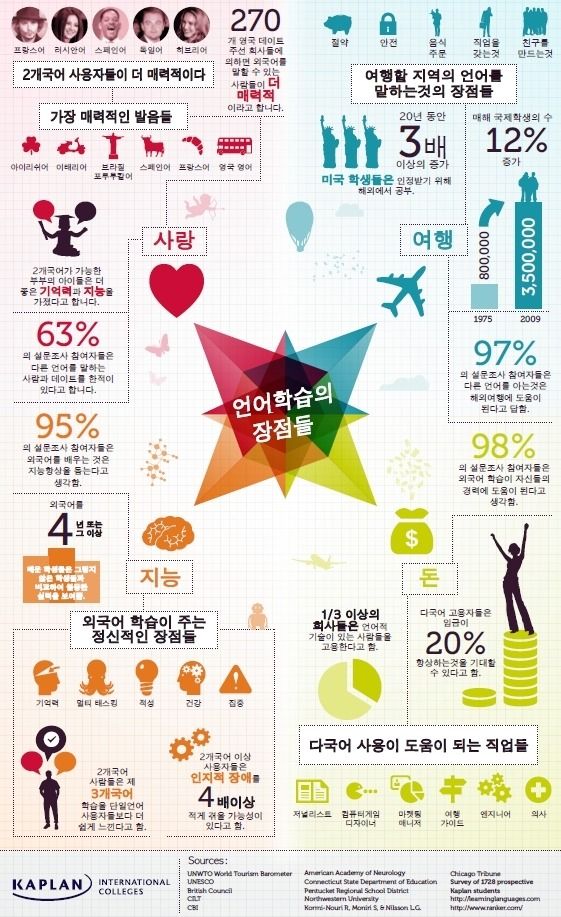 "피하지 못할 바에는 즐겨라”는 말이 있듯이, 스펙이 된 외국어 학습도 이제는 능동적으로 대처해야 할 때입니다. 그렇다면 외국어를 공부해서 얻을 수 있는 장점을 보다 구체적으로 말씀드려 볼게요, 공신력 있는 기관들이 연구 조사한 인포 그래픽 결과를 바탕으로, 외국어 학습의 장점을 4가지 주제인 "사랑, 여행, 지능, 돈" 으로 나누어 살펴보겠습니다.