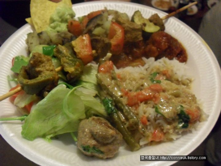 샐러드, 타이 카레, 감자 요리, 고기(바베큐) 요리, 미트볼, 피자 등등