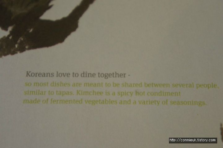 한국인들은 반찬 및 음식들을 함께 나누어 먹는다고 알려 주고 있어요. 보통 영국인들은 자기가 시킨 음식만 먹잖아요. 또한 김치에 대한 설명도 있습니다.