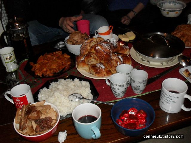 작년에 신랑의 친구들로부터 크리스마스 파티에 초대를 받아 가게 되었어요. 각 자 자신들이 만든 음식을 한가지씩 준비해서 오라고 하더군요. 특별히 크리스마스 음식이 없는 저희로서는 매콤 달콤한 닭갈비와 밥을 준비했지요. 파티 장소에 도착해보니, 아직 친구들이 크리스마스 음식 준비를 하고 있더군요.