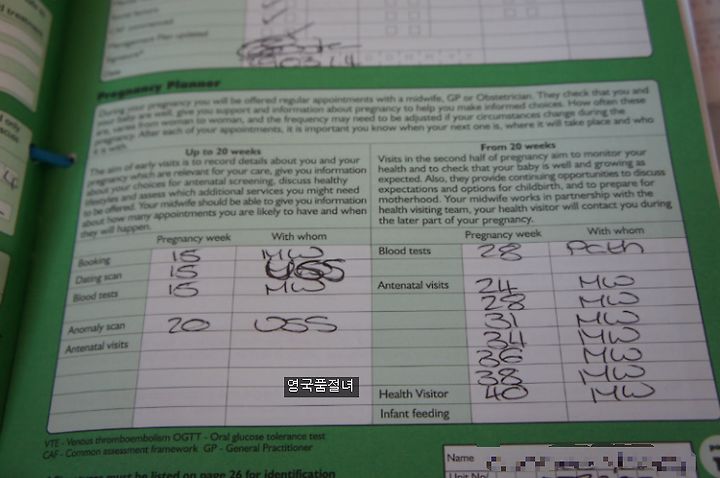 영국 산전 정기 검진은 근처 병원 및 GP에서 조산사와 만나 산전관리가 이루어집니다. 조산사는 산모 노트(Maternity Note)를 지급하며, 산모가 관리합니다. 한국과 달리 초기에는 산전 검사를 위해 조산사를 한번 만납니다. 그 후 중기에는 매달, 후기에는 2주마다, 막달에는 매주 조산사와 만나 산모의 상태에 대해 이야기를 나누고 태아의 심장 박동 소리 청취와 배 둘레 재기, 상담 등 산전 관리가 이루어져요. 반면에 한국은 보건소와 산부인과에서 산전 관리를 받으며, 보통 담당 산부인과 의사들이 산전 관리를 하고 있지요.