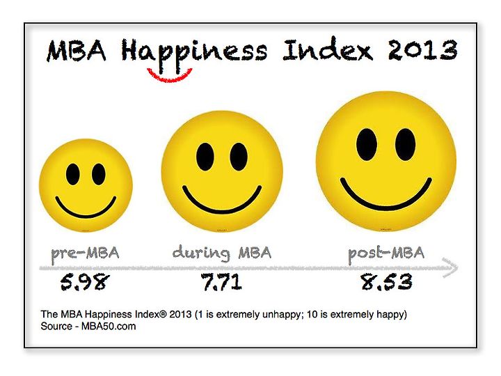 MBA 출신자들의 행복 지수는 MBA 전후로 이렇게 차이가 난다고 하네요.