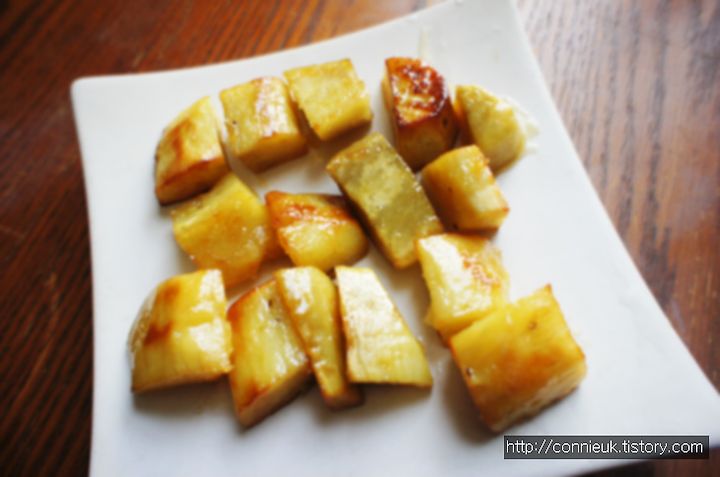 1. 기름이 담긴 팬을 달군 후에, 고구마를 잘라서 넣고 얕은 불에 골고루 익힙니다.