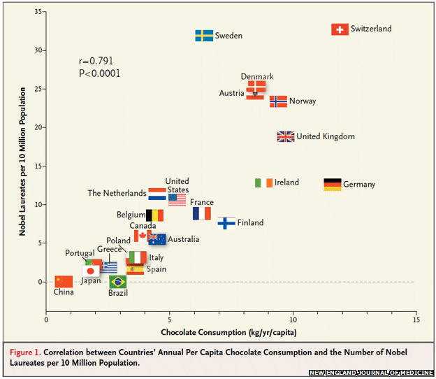두 달 전에 BBC 뉴스에서 초콜릿 섭취는 노벨상을 탈 수 있는 기회를 높여준다. (Eating more chocolate improves a nation’s chances of producing Nobel Prize winners) 라는 기사를 읽었습니다. 최근 콜럼비아 대학에서는 노벨상 수상자를 많이 배출한 국가와 그 나라의 초콜릿 섭취량 간의 깊은 연관성이 있다는 결과를 도출하여 New England 의학 저널에 실려 큰 화제가 된 바 있습니다. 즉, 각 나라의 일인당 인구의 노벨상 수상자 숫자와 초콜릿(cocoa) 섭취량에 상당한 관련성이 있음을 밝혔습니다.