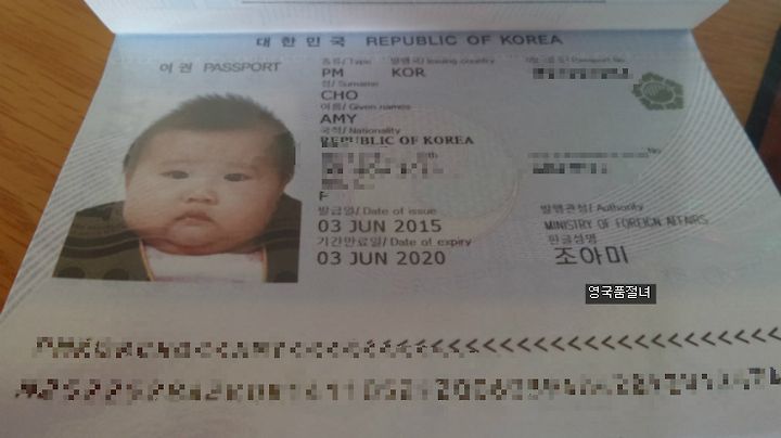 약 1주일 지나 수령한 아기의 여권은 짜잔… 다음과 같습니다. 이런~ 더 넓적해 보입니다. 나중에 아기는 이 사진을 무척 싫어할 지도 모르겠지만, 그래도 철 좀 들면 재미있는 추억(?)으로 이해해 주기만 바랄 뿐이지요. 전 그때 말할 겁니다.