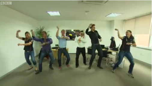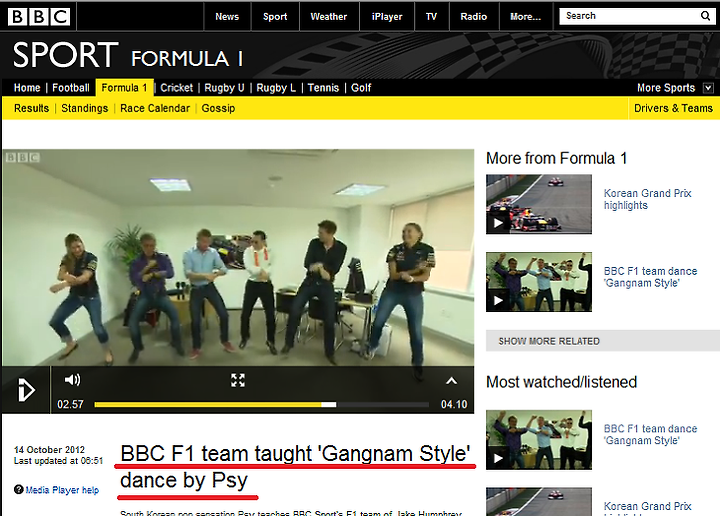 특히 한국에서 열린 F1를 취재하기 위해 영국 BBC 팀도 왔습니다. 영국 BBC 1 라디오 싱글 차트에서도 1위를 한적이 있는 (현재는 3위) 싸이의 강남 스타일로 인해, 여기 영국인들도 무척 관심이 많은데요, BBC F1 취재팀들도 전 세계적으로 히트를 치고 있는 싸이의 강남 스타일 말춤을 배웠다는 기사가 떴어요.
