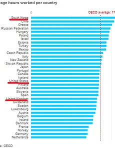 어제 영국 BBC를 보다가 눈에 띄는 제목의 기사가 있었습니다. Who works the longest hours? (누가 가장 일을 오래할까?) 전 제목만 보고도 정답을 바로 알 수 가 있었지요. 역시나 제가 생각했던 것이 정답이었습니다. 바로 South Korea (한국) (출처: BBC) BBC의 기사를 요약해 보면요. 일반적으로 말하면, 긴 노동 시간은 시간 당 계산해 보면 생산성이 떨어진다. 보통 아시아 국가들의 노동 시간은 긴 편이다. 특히 개발 도상국이 그렇다. 이에 반해 선진국인 유럽, 미국 등은 노동 시간이 상대적으로 짧은 편이다. 단순 비교는 어렵지만, 가장 큰 이유는 미국, 유럽 국가들은 휴가(출산, 질병, 크리스마스, 부활절, 여름 등)일수가 다소 많기 때문이다. 그런데, 한국이 노..